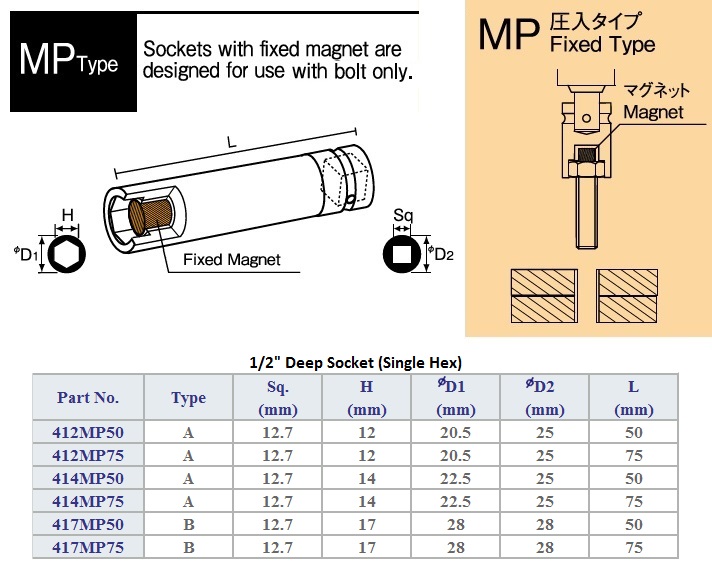 1/2" MP Deep Socket (Fixed Magnet Type)