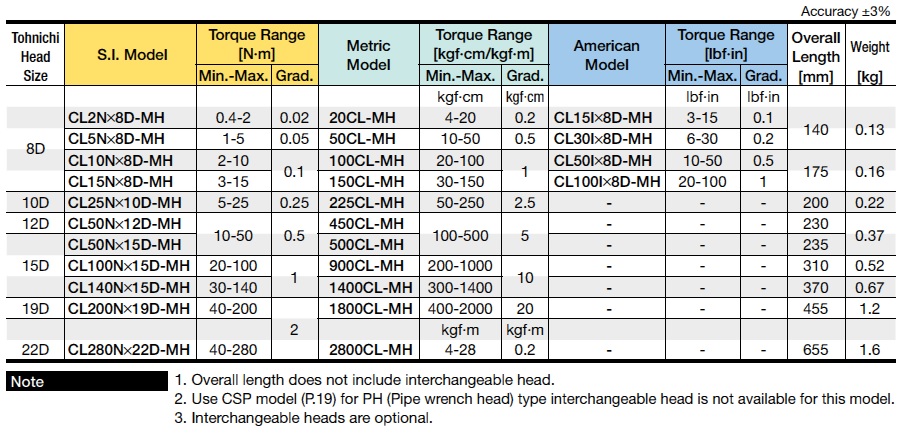 **Note that CLTorque Wrenches need to go with matching Tohnichi Head Sizes.