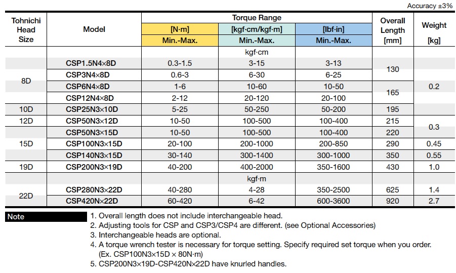 **Note that CSP Torque Wrenches need to go with matching Tohnichi Head Sizes.